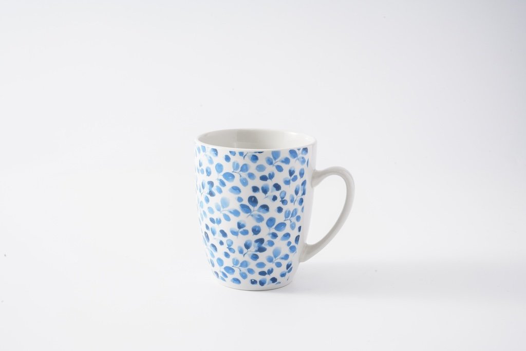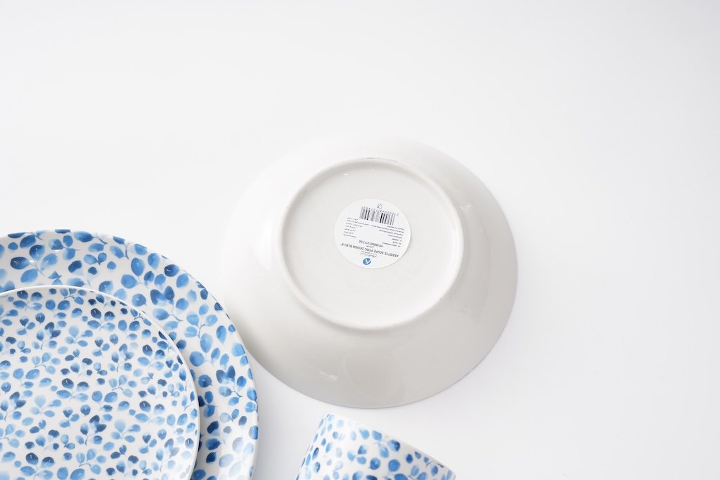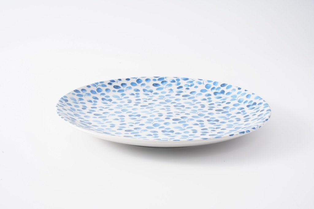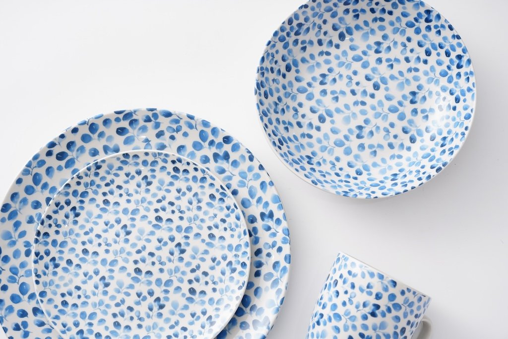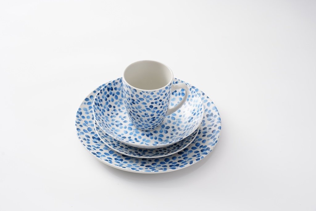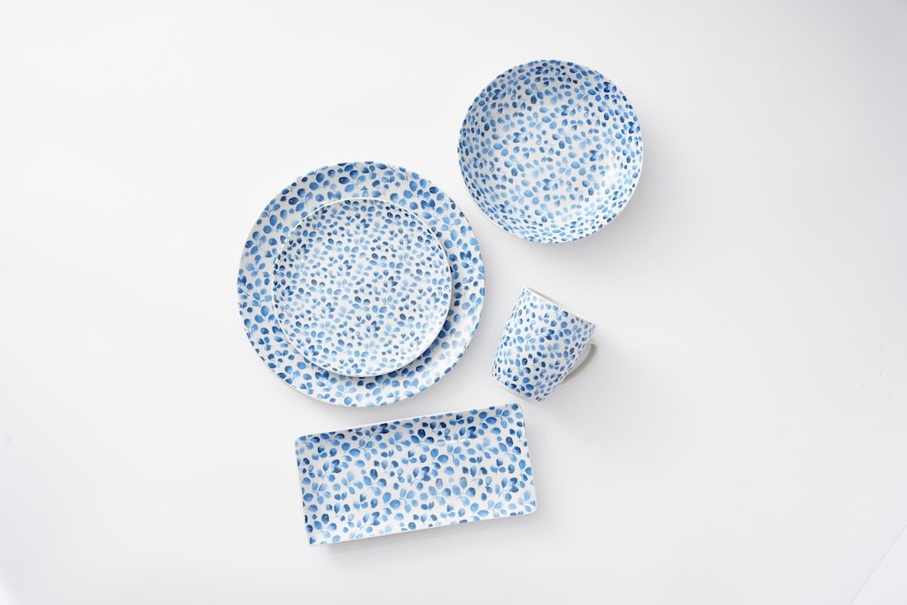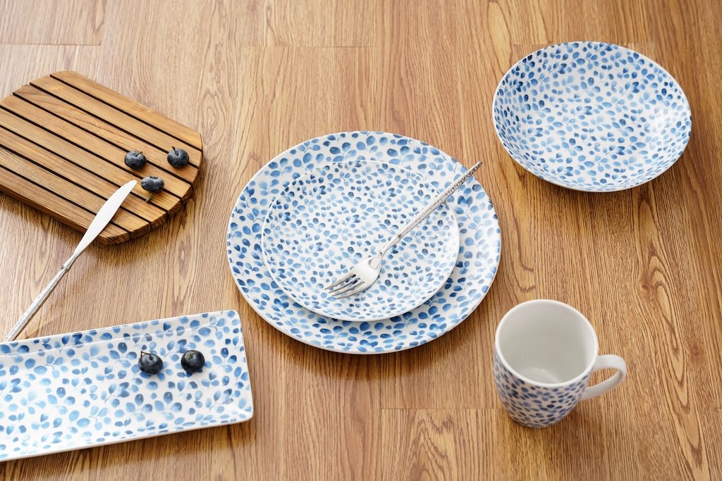 Playful blue dotted ceramic plates and mugs, combining simplicity and charm for versatile dining needs.